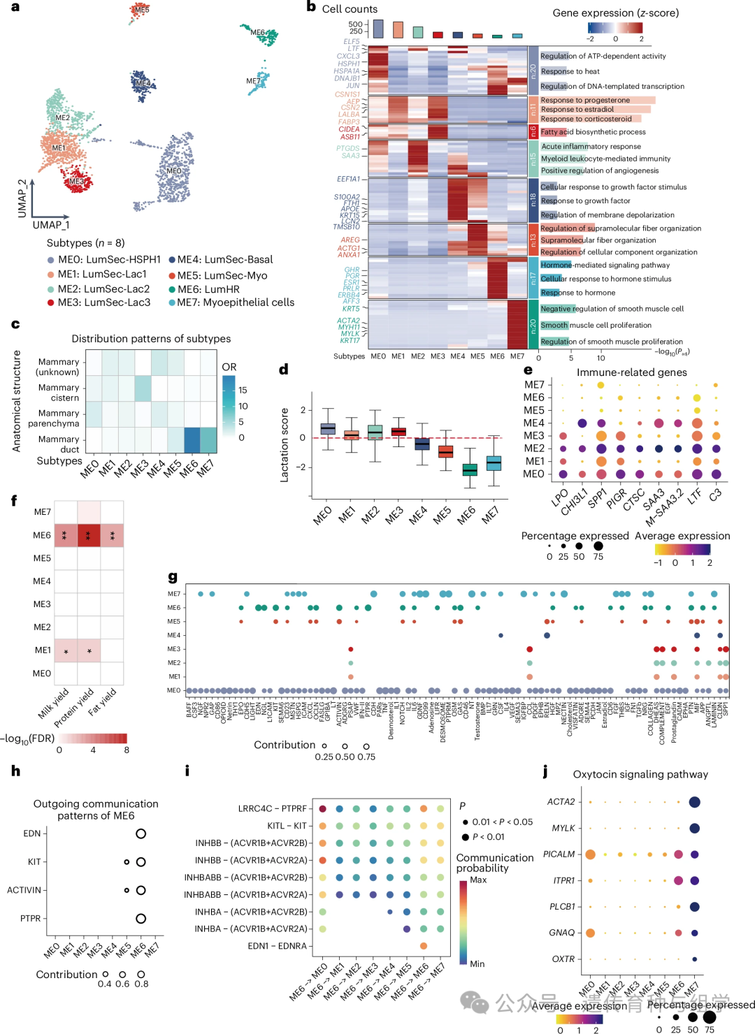在重要性状机制解析方面,针对产奶这一核心育种目标性状,深入分析乳腺上皮细胞,发现乳腺上皮细胞分为8个亚型,其中6个腔分泌细胞亚型(ME0-5)高表达 ELF5、LTF  等标记基因,ME0-3亚型因高表达泌乳相关基因,与乳汁生物合成密切相关;腔激素响应细胞亚型(ME6)表达 ESR1、PGR、PRLR 等激素受体基因,可能通过激素信号调控乳腺泌乳功能;基底肌上皮细胞亚型(ME7)高表达 OXTR、PLCB1  等催产素信号通路基因,参与乳汁排出过程中的乳腺收缩。