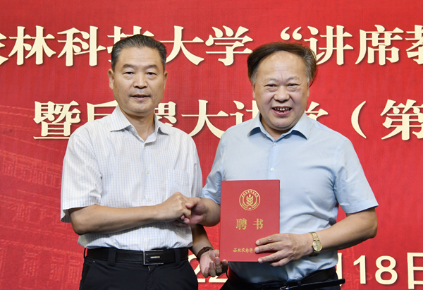 7月18日,学校在国际交流中心104会议室举办“讲席教授”聘任仪式暨后稷大讲堂(第五讲)相关活动,中国工程院院士、中国农业大学谯仕彦教授从校党委书记李兴旺书中接过聘书,成为我校“讲席教授”。副校长马建华,学校相关部门负责人、动科学院负责人和师生代表参加聘任仪式。