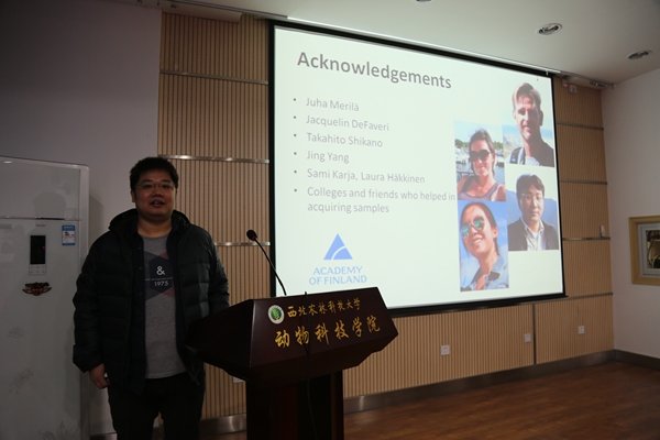 12月18日上午,瑞士苏黎世大学、芬兰赫尔辛基大学博士后郭宝成博士来校进行学术交流,并在学院107会议室做题为“From Marine to Freshwater: Genetic Basis of Adaptive Radiation in Sticklebacks”的学术报告。报告由昝林森副院长主持,学院40余名师生参加了报告会。