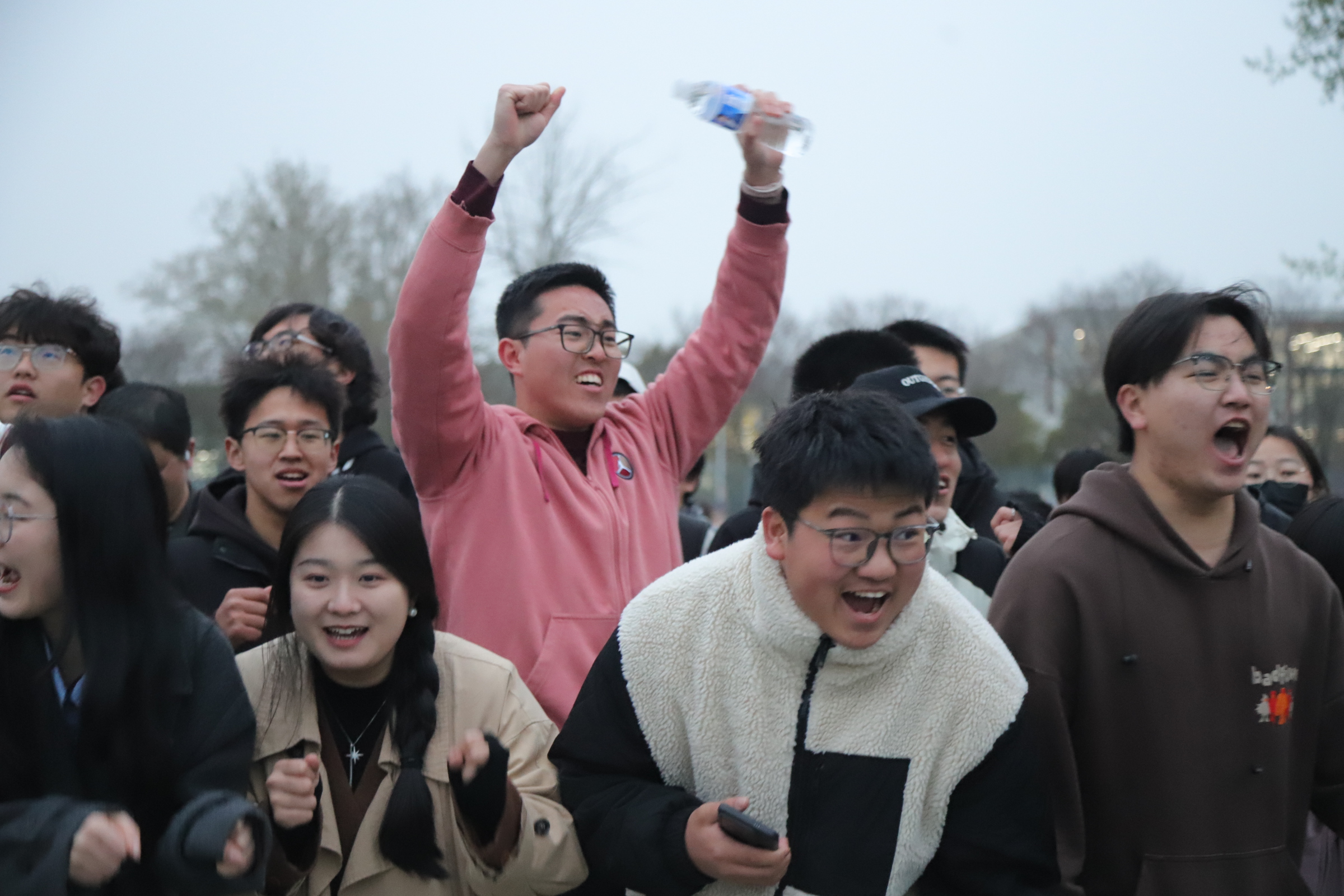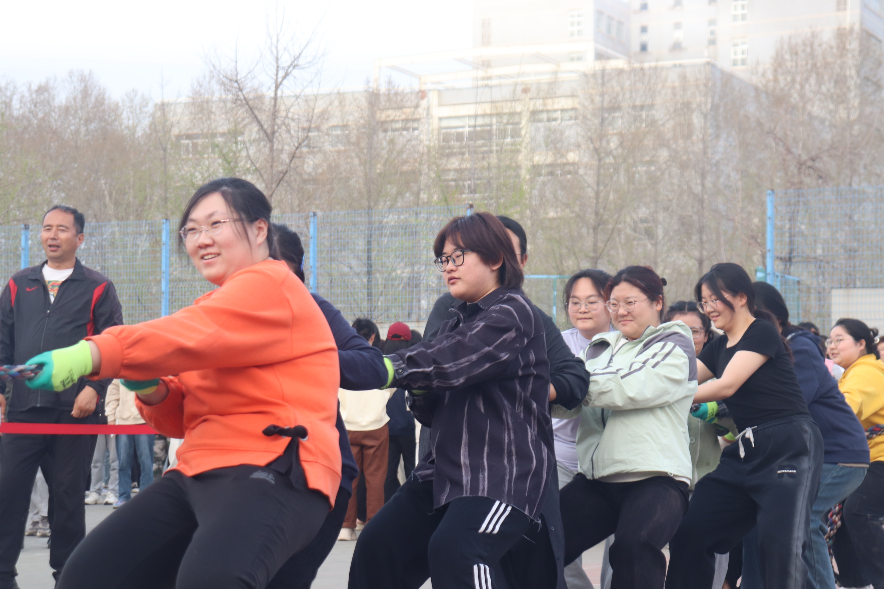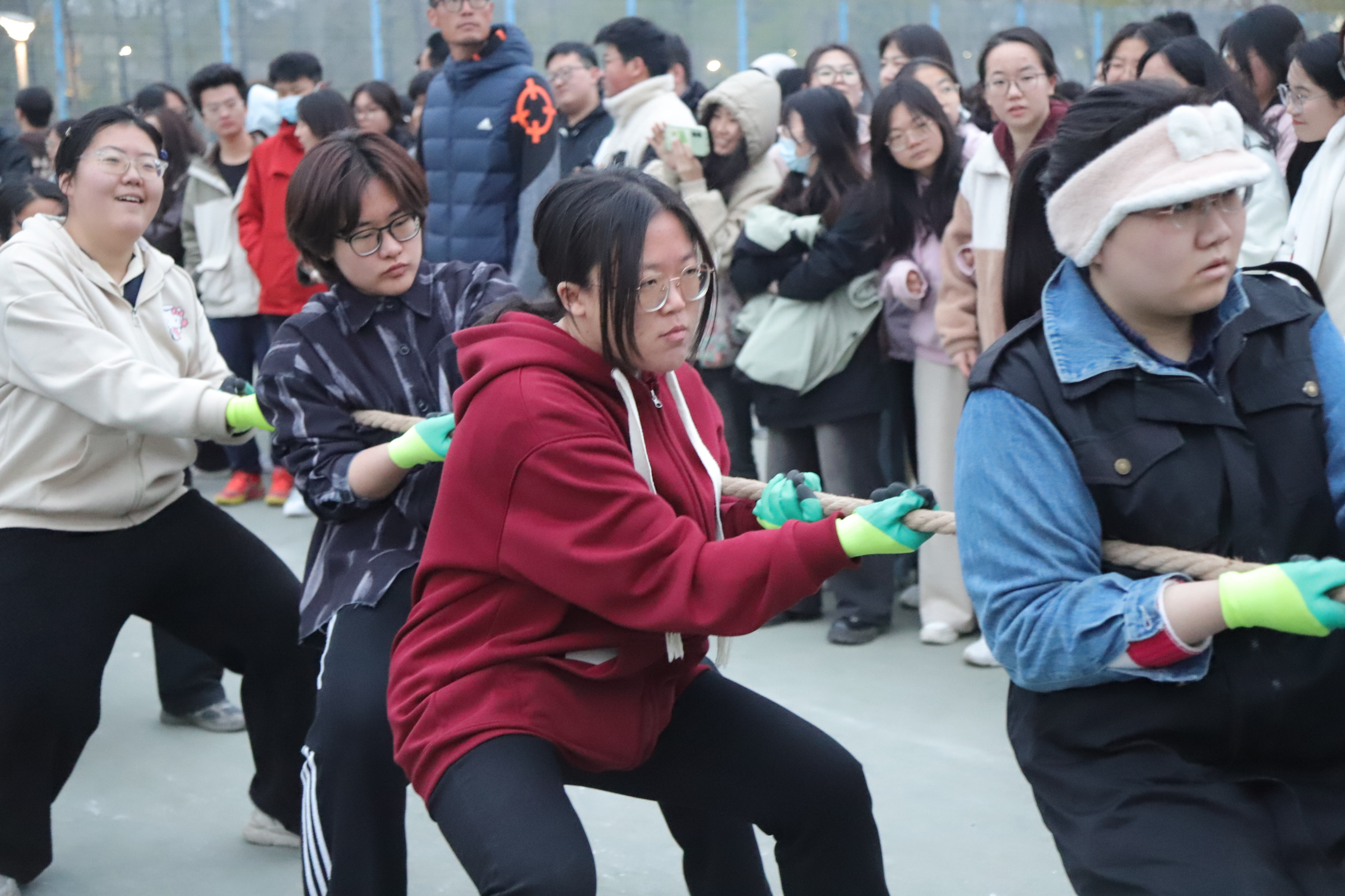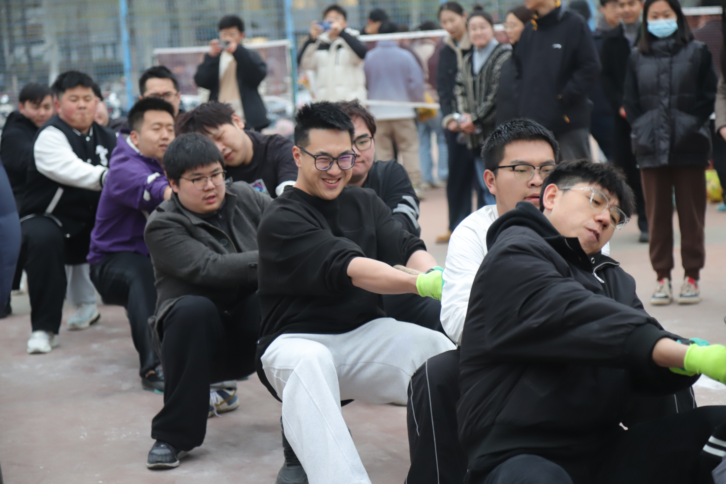 伴随着裁判员清脆的哨声,探花系列 拔河队队员们在领队的指挥下,扎稳马步、手握绳索、压低重心、凝“绳”聚力、铆足干劲争创佳,大家一根绳、一条心,心往一处想、劲往一处使,人绳合一尽显英雄本色。赛场外,学院师生为队员们全力加油呐喊,比赛现场气氛热烈,“一!二!一!二!”助威声势如破竹,掌声、呐喊声、助威声此起彼伏,不绝于耳,比赛过程精彩纷呈,高潮迭起。