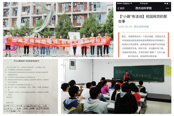 动科学院借助微信平台上推出“小萌”有话说——校园网贷的那些事,通过真实的案例向同学们阐述不良网络借贷的危害,同学们纷纷点赞并转发;各学生班、研究生班通过开展主题班会、演讲比赛等丰富多彩的活动认真学习金融、网络安全知识,使理性消费观念深入人心;学院团工委学生会在西超前开展“远离不良网络借贷,创建文明和谐校园”校园宣讲活动,向过往学生讲述不良网络借贷的危害,呼吁广大学子“不从事、不协助、不怂恿”不良网络借贷活动,做文明理性大学生,营造和谐稳定校园氛围。同学们纷纷在微信平台、条幅、宣传板上留言签字、表明立场,并在《远离校园不良网络借贷承诺书》上签字,用自己的实际行动表明自己远离不良网络借贷的坚决信心。