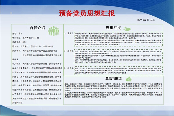 会议听取了水产养殖学专业各班级拟发展预备党员思想汇报,并就2013级各班拟推荐人选手抄报进行评议。