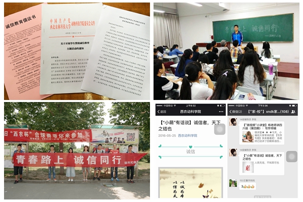 学院团工委学生会在西超前开展“青春路上,诚信同行”校园诚信宣传与签名活动,工作人员向过往学生发放《诚信教育倡议书》,讲述诚信资助的先进事迹,呼吁广大学子向榜样学习,学习诚信、经济诚信、生活诚信、贷款诚信、上网诚信、就业诚信,从自我做起,从小事做起,遵守诚信誓言,把诚信真正落实到学习、工作和生活当中。用诚信理念规范自己的言行,以实际行动团结和影响周围的同学,共同创造西农学子良好的诚信形象!同学们纷纷庄重地在“青春路上、诚信同行”的条幅上签下自己践行诚信的青春诺言。动科143班惠一晴同学表示:作为一名学生干部,我将在今后的学习和工作中身先力行,诚信做人、诚信做事,以实际行动使诚信之花开满校园、香溢西农!