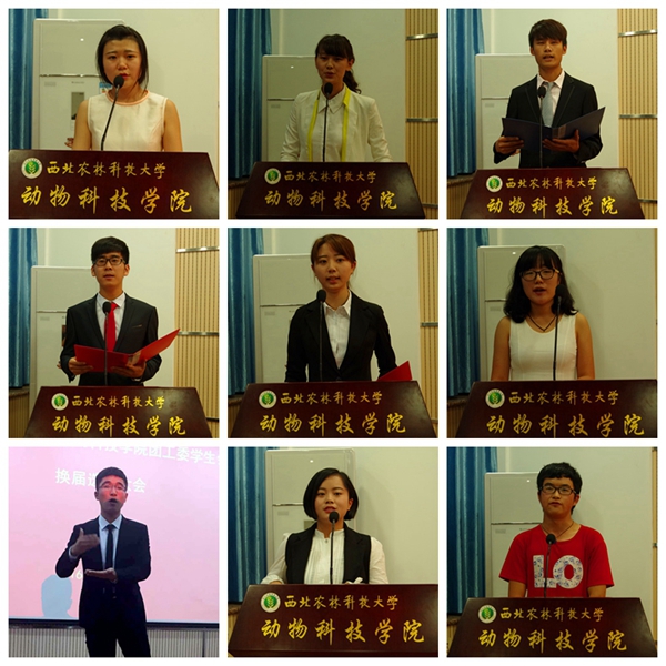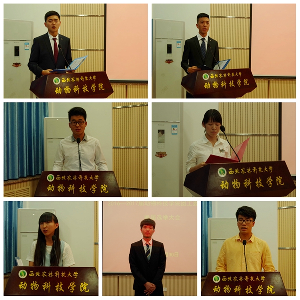 团工委副书记候选人霍丽坤首先感谢两年来在学生会的平台中让自己成长与历练,由于热情所以选择继续坚持和奉献,并希望进一步提高和完善自己,用自己的满腔热血来做好团学干部的精神文明建设和队伍建设;学生会主席候选人李新舟则以反思过去的工作首先做到自省,同时就学生干部团队建设与培养、部门之间的合作与交流、主体工作与创新工作的齐头并进等方面提出了自己建设性的想法与意见,希望通过自己与老师及全体团学干部一起接过接力棒,将团学工作的辉煌及动科精神进一步发扬发展。学生会副主席候选人惠一晴则就探花系列 现阶段几个日常管理部门做出清晰分析并提出自己的工作设想,同时表达了自己将继续发挥热量,完善自我,将探花系列 团学工作及学生干部团队建设与培养进一步做精、做强。所有主席团及部长候选人上台发表竞职演讲,以饱满的热情和最佳的精神状态以期望继续在团学大家庭中继续奋斗。
