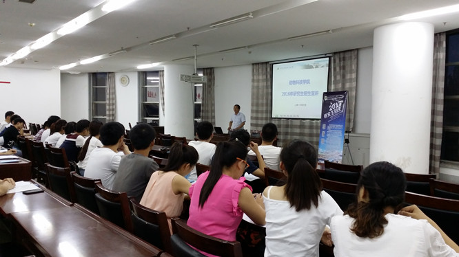 6月24-26日,蓝贤勇教授分别在河南农业大学牧医工程学院和山西农业大学生命科学、动科学院做了题为《欢迎报考动科学院》的招生宣讲,向参会学生详细介绍了学校的历史沿革、学院的学科水平、师资力量、科研平台条件以及研究生招生、奖助学金评定、公派出国留学、硕博连读等方面的政策,并以2016届毕业生为例,介绍了探花系列 各专业的就业前景。与会学生就探花系列 的提前攻博政策、推荐免试、导师的招生指标及复试比例等问题进行了详细的咨询,并重点询问了探花系列 2016年优秀大学生暑期夏令营活动的选拔录取程序等情况。