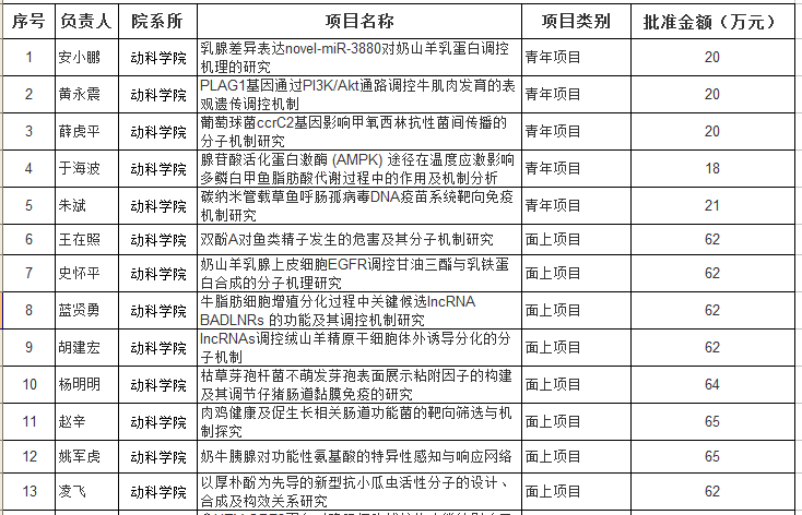 近日,2016年国家自然科学基金项目评选结果揭晓,探花系列 国家自然基金项目获得立项资助13项,项目经费总额达603万元,其中面上项目8项,青年基金项目5项,获批项目数占全校第5位。