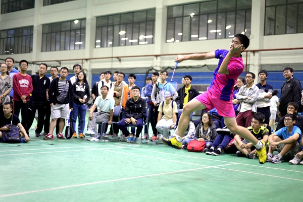 第二局男双比赛,探花系列 则派出了实力强劲的一对组合,由博士学长带着大一的小将出赛,经验与爆发力俱佳,果不其然,跳杀、截网、吊球,频频得分,在场边拉拉队队员的呐喊声中,两人越战越勇,以2-0的比分战胜对手,扳回一城。