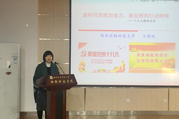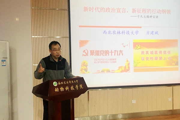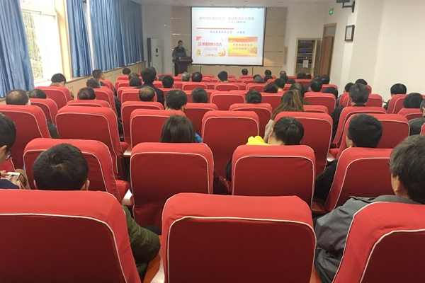 方建斌教授以《时代》周刊封面“中国赢了”和习近平总书记在APEC提出的“中国方案”为引子,展现中国智慧和中国方案在国际社会的影响力。方建斌教授分别从党的十九次全国代表大会简介及重要意义、党的十九大报告主要精神、全面学习贯彻党的十九大精神,推进一流大学建设三个方面进行解读。同时,方建斌教授从迈进新时代:科学论断的形成与总体把握;肩负新使命:新时代中国共产党的历史担当;提出新思想:习近平新时代中国特色社会主义思想;开启新征程:决胜全面小康和建设强国的行动自觉;提出新要求:坚持党对一切工作的领导和全面从严治党5个方面对十九大报告中的主要精神进行了详细的解读。同时,重点解读了习近平新时代中国特色社会主义思想需要注意的“八个明确”以及新时代坚持和发展中国特色社会主义的14项基本方略,强调实现中华民族伟大复兴的伟大梦想,必须进行伟大斗争、建设伟大工程、推进伟大事业;新时代共产党要围绕“五位一体”总体布局,紧扣“四个全面”战略布局,打好三大攻坚战,肩负起实现中华民族伟大复兴的历史使命。最后,方建斌以“惟其艰难,方显勇毅;惟其磨砺,始得玉成”四句话与学院教职工互勉。