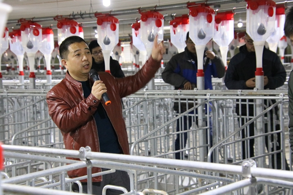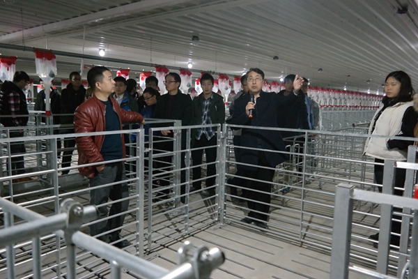 在参观过程中,徐延岭总经理从场区的设计理念、种猪来源、养殖设施、防疫手段、生产流程、管理技术、环境保护,以及农业结构和农村经济结构调整,地区经济发展和推动生猪产业化发展进程等方面向师生做了全面细致的讲解。同学们边参观,边记录,边学习,针对“云养殖”概念,以及近年来畜牧业较为棘手的种源问题、疫病防治、粪污处理和环境保护等问题与徐延岭总经理进行了深入交流。