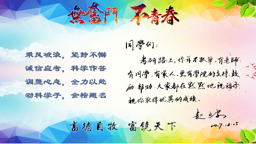 从指导到辅导,从宿舍到自习室,从科研产品到人文关怀,学院师生为实现学子心中的深造梦想,携手同心输送正能量。考研学子也深受激励,纷纷表示要诚信考试,充满自信,认真备考,用最佳的状态和最好的成绩回馈集体、成就自我。