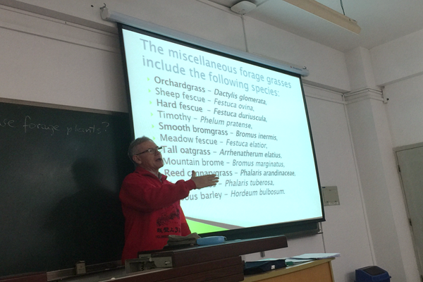 Roman Hołubowicz教授为草业科学大三学生共授课《Forage Seed Science》课程10学时,他系统地介绍了牧草(饲草)的应用,常见牧草如苜蓿、三叶草、羽扇豆、黑麦草、肯塔基早熟禾和鸭茅等的种子结构、花卉结构,以及土壤条件、播种要求、田间管理、贮藏等技术要点,并介绍了整个生产过程中相关的机械化操作技术与方法。在为草业科学大二学生讲授的10个学时的《Forage Plant Breeding》课程时他主要介绍了牧草(饲草)的应用、育种的基本相关概念,常见草种的种子、花结构,以及其营养繁殖技术、有性繁殖技术、分子育种和突变、育种主要目标性状、引种方法等内容。
