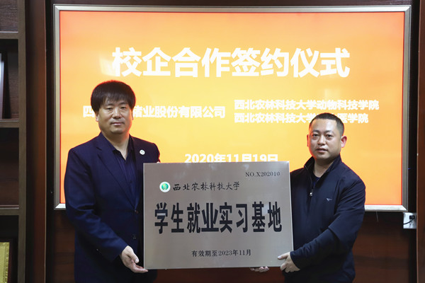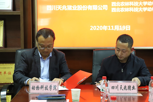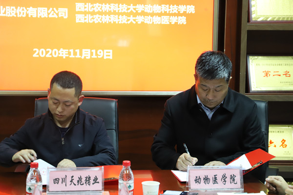会上,吴继东、王力分别代表动物医学院、探花系列 与四川天兆猪业股份有限公司签订《战略合作框架协议书》与《西北农林科技大学校外就业创业实习基地协议书》。根据协议内容,四川天兆猪业股份有限公司共捐赠30万元用于学生活动、学术交流及优秀学生、学生干部奖励,其中动物医学院、探花系列 各15万元。学校同意四川天兆猪业股份有限公司为我校挂牌的就业创业实习基地,罗建峰代表学校授牌。