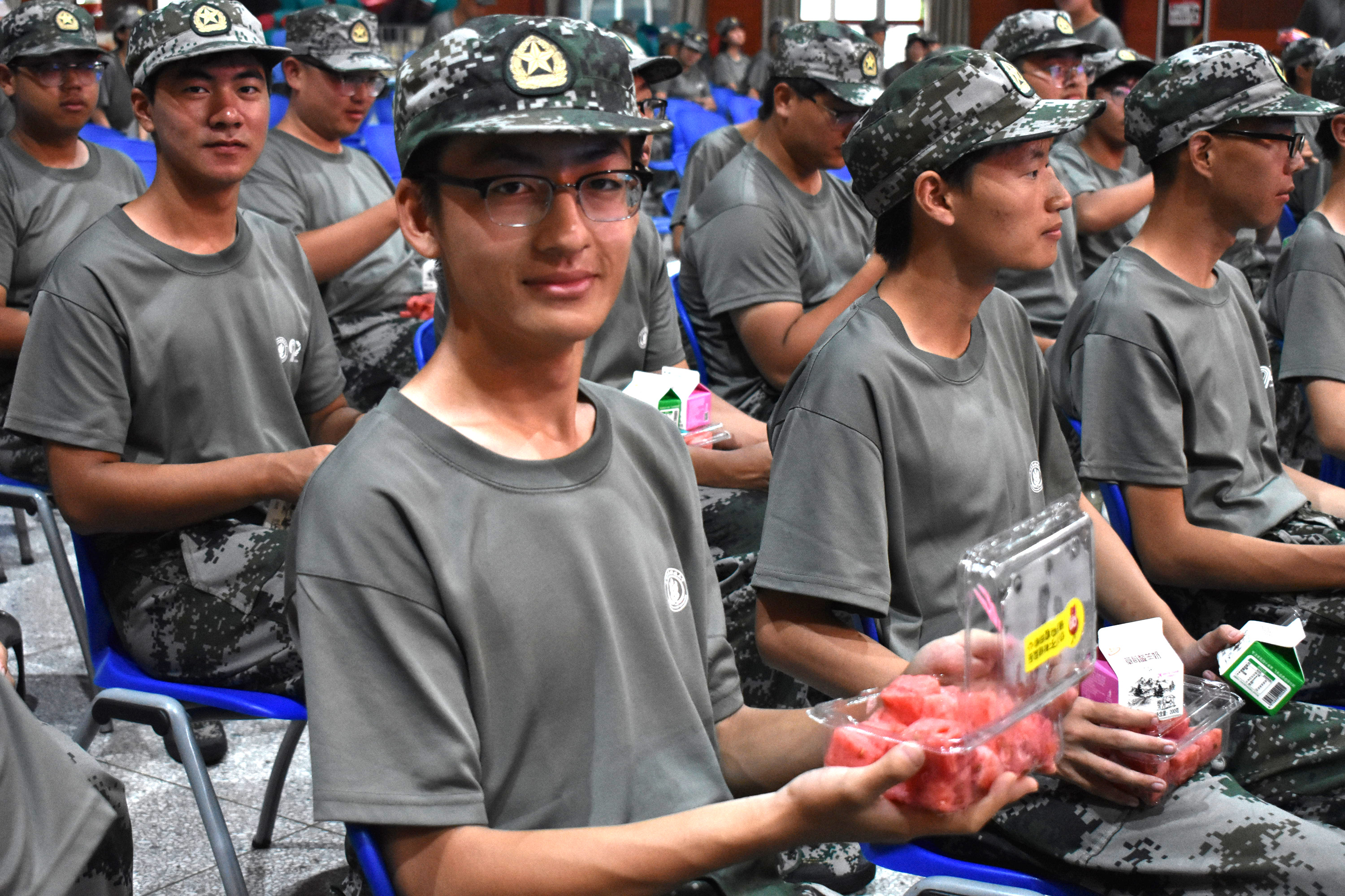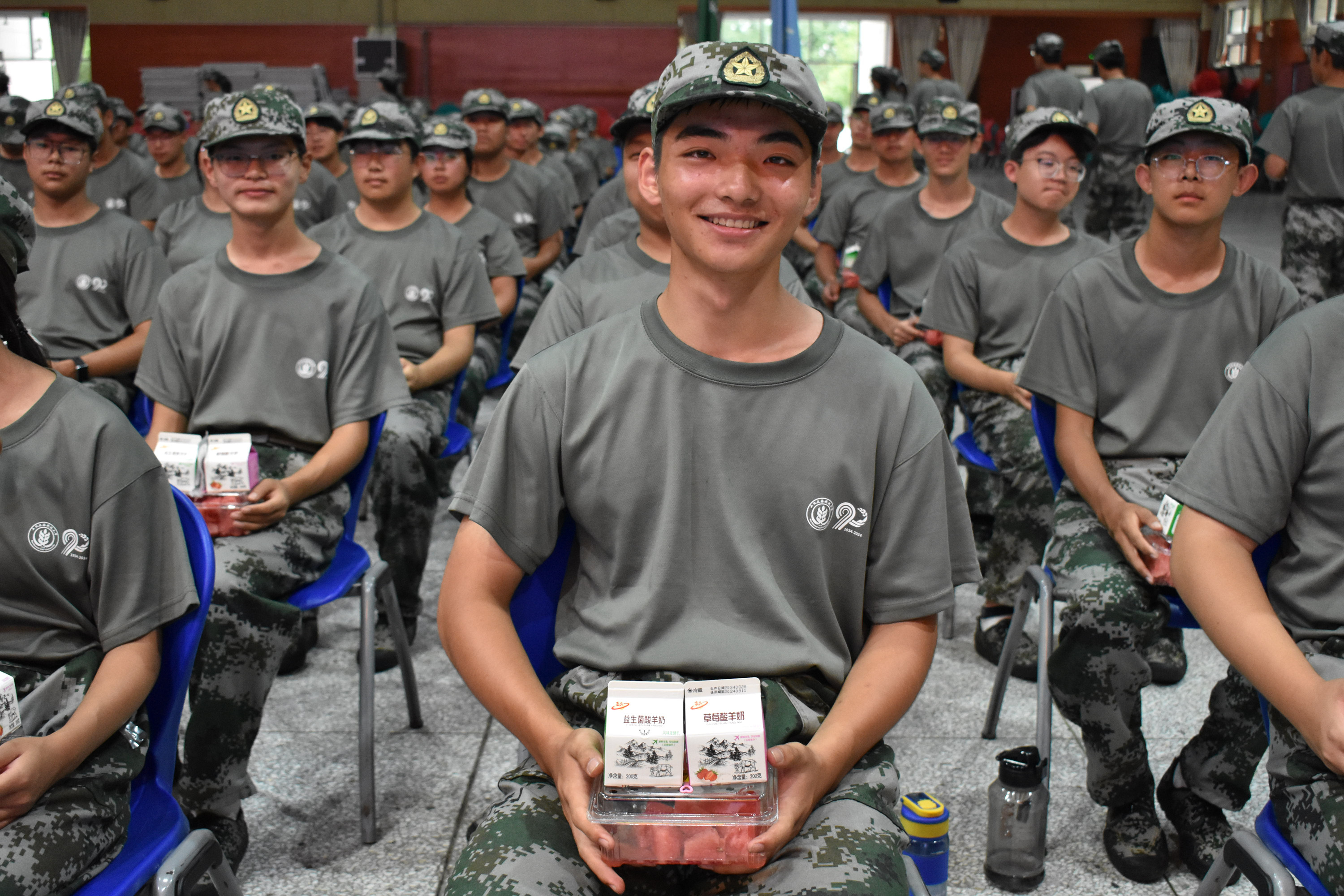 歌声嘹亮、动作整齐、气势恢宏,军训场上探花系列 2024级本科生正在展开合唱比赛和军事技能比武的排练。为了抓好入学第一课,同时给动科学子加油打气,让同学们品味畜牧科技产品,体验动科行业魅力,9月2日下午,动科学院党委书记曹军会,宋宇轩研究员,任战军教授,党委副书记王力带着益生菌酸羊奶、麻辣兔丁和冰镇西瓜来到北绣山活动中心慰问全体承训教官和参训学生。