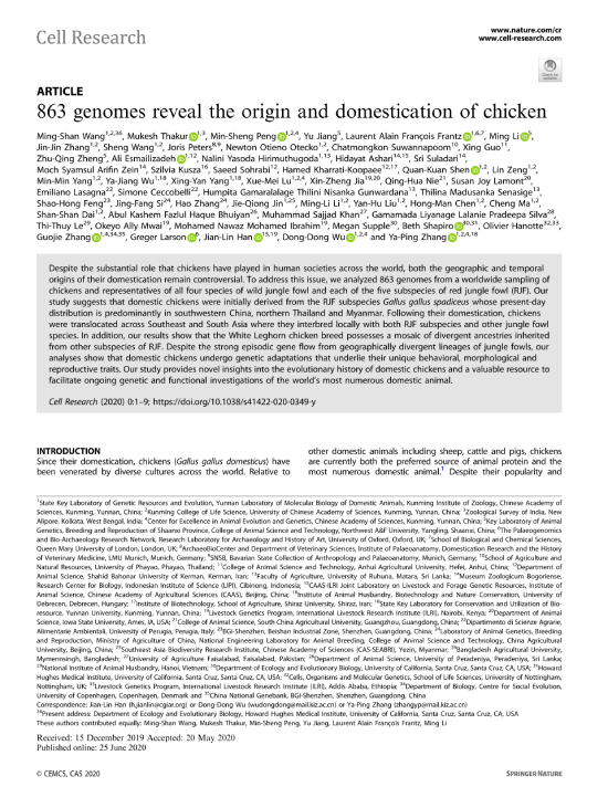 尽管家鸡对全人类的生产和生活产生了世界性的影响,但其驯化的地点和时间仍存在巨大争议。2020年6月25日,中国科学院昆明动物研究所和中国农业科学院北京畜牧兽医研究所牵头,联合国内外30余家高校和科研单位共同完成,在 Cell Research 在线发表了题为“863 genomes reveal the origin and domestication of chicken”的原创性研究论文。本研究首次系统地对包括分布于南亚、东南亚和东亚的地方鸡品种和所有四个原鸡种以及红原鸡五个亚种在内的863份样品的全基因组进行了测定,这一成果为深入认识家鸡的演化过程提供全新的视野,并有助于理解这一地区人类与其它驯化物种(例如水稻、狗、水牛和家猪等)互动的历史。张亚平院士、吴东东研究员及韩建林教授共同通讯,探花系列 姜雨教授、中国科学院昆明动物研究所王明山和彭旻晟博士、印度国家动物学普查机构M. Thakur博士、和在读博士生李鸣及英国牛津大学L. A. F. Frantz博士为该论文共同第一作者。