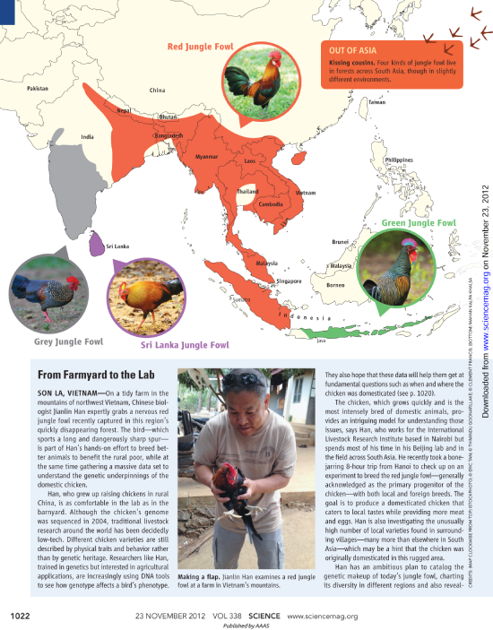 特别值得一提的是,在该论文发表之际, Science 杂志在Animal Domestication专栏发表了题为“Dawn of the chicken revealed in Southeast Asia: Chicken domestication—debated since Darwin—tracked by genomic survey(东南亚鸡的黎明破晓:基因组大数据诠释始于达尔文的家鸡驯化纷争)”的点评文章,通过采访伦敦大学学院的Dorian Fuller博士、威斯康辛大学(麦迪逊)的Jonathan Kenoyer博士(美国艺术与科学学院院士)以及史密森学会的Melinda Zeder博士(美国艺术与科学学院院士和美国科学院院士)等国际考古学著名学者,第一时间对该项研究成果进行系统地盘点。这也是继 Science 于2012年介绍中国农业科学院-国际家畜研究所“畜禽牧草遗传资源联合实验室”韩建林教授有关鸡的研究工作之后,再次深度点评他及合作团队在家鸡起源和驯化方面的重要发现。