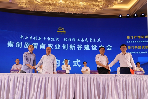 我校陈玉林副校长代表西北农林科技大学与渭南市人民政府签定秦创原渭南农业创新谷建设合作框架协议签约。学院副院长杨小军代表学院与陕西石羊农业科技股份有限公司签订产学研项目合作协议签约。