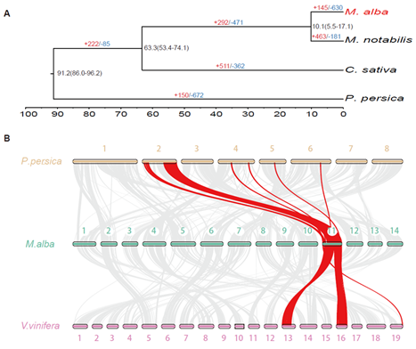 图2 (A)白桑(Morus alba)与川桑(M. notabilis)的分化距离在1千万年左右,(B)基因共线性分析表明,白桑与葡萄(Vitis. vinifera)和桃(Prunus persica)基因组没有加倍的事件发生
