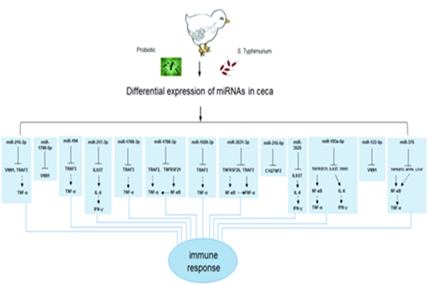 消化道与乳腺生物学实验室通过对鸡胃肠道进行取样调查,分离出多株乳酸菌,并将它们应用于沙门氏菌引起的鸡肠道炎症,结果发现乳酸菌能显著减轻宿主的炎症反应。研究还发现乳酸菌能够改变肉鸡肠道中miRNAs的水平变化,miRNAs又通过对其靶向基因调控进而减缓沙门氏菌引起的肠道炎症。